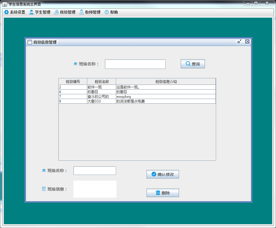 然后来看看班级信息管理,包括班级信息的添加、修改、查询、删除:
