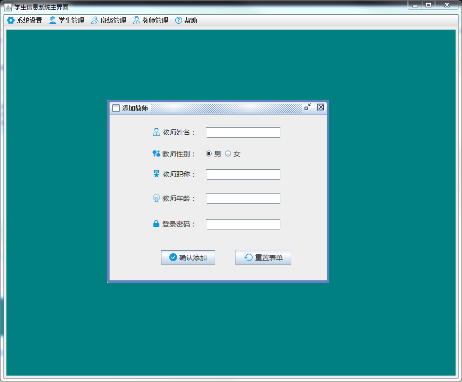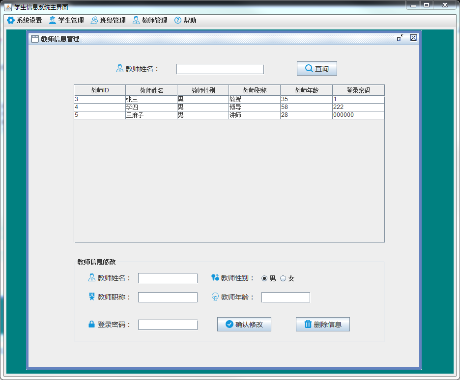 接下来是老师信息管理,包含老师信息添加、查询、修改、删除: